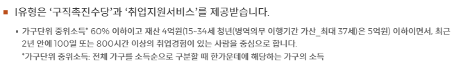 가구 소득이 중위소득의 60% 이하이거나, ‘특정 계층’인 사람이, 취업 후 6개월간 계속 근무하면 50만원 을, 그 이후 6개월간 계속 근무하면 추가로 100만 원을 지급한다.