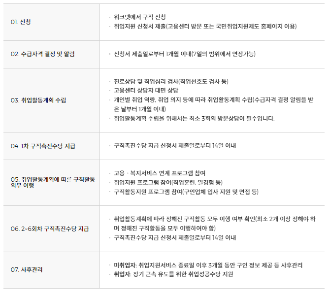 개인별 상황에 맞는 다양한 지원을 제공하며 취업에 성공할 수 있도록 1년간 지원해 준다. 취업하지 못한 경우에는 고용센터 담당자 판단에 따라 6개월 범위 안에서 지원 기간을 연장할 수 있다.