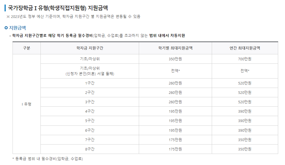 ※ 대학의 지원대상에 따라 지원금액이 다르므로, 자세한 금액은 대학별 문의 필요
